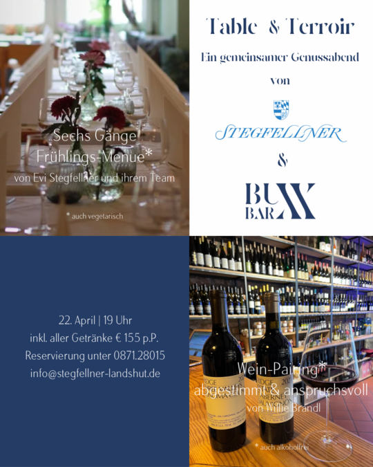 Erleben Sie ein exklusives Wein- & Dine-Event, bei dem jedes Detail auf Genuss ausgerichtet ist: Table & Terroir vereint das Restaurant Stegfellner in Landshut und die BuxxBar zu einem unvergesslichen Abend.